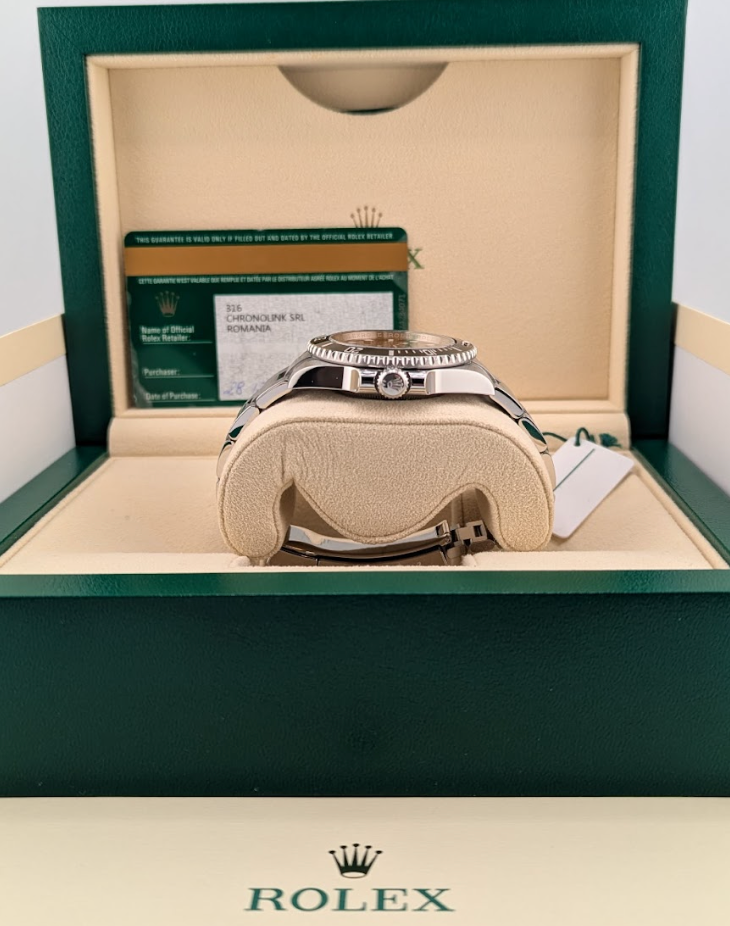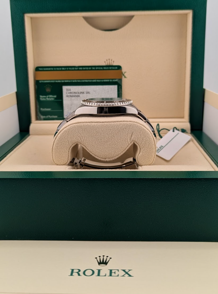 The 40mm Oystersteel case features the robust “maxi case” profile, offering a bold wrist presence while maintaining perfect balance and comfort. It is paired with a black Cerachrom unidirectional bezel, engineered for exceptional scratch resistance and long-term color retention, with platinum-filled graduations for optimal underwater legibility.