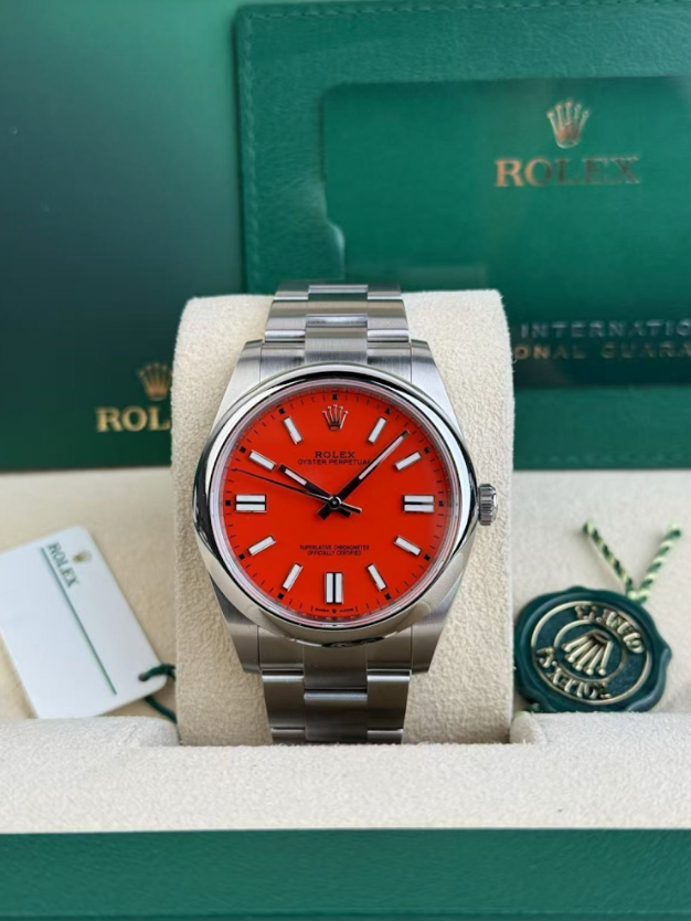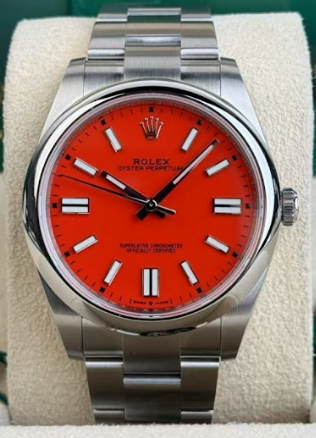This Rolex Oyster Perpetual has the bold and vibrant Coral Red dial – one of the most popular (and now discontinued) colors from Rolex’s colorful dial lineup. If you’re looking for something fun, fresh, and still unmistakably Rolex then check out this stunning watch!